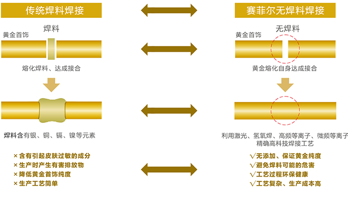 为了满足消费者对更高纯度黄金的消费需求,赛菲尔珠宝首创无焊料焊接技术,通过"高温自熔"、"镭射点焊"、"微频等离子"、"高频等离子"等物理技术手段的处理,让黄金饰品的接口发生自熔,达成接合。
